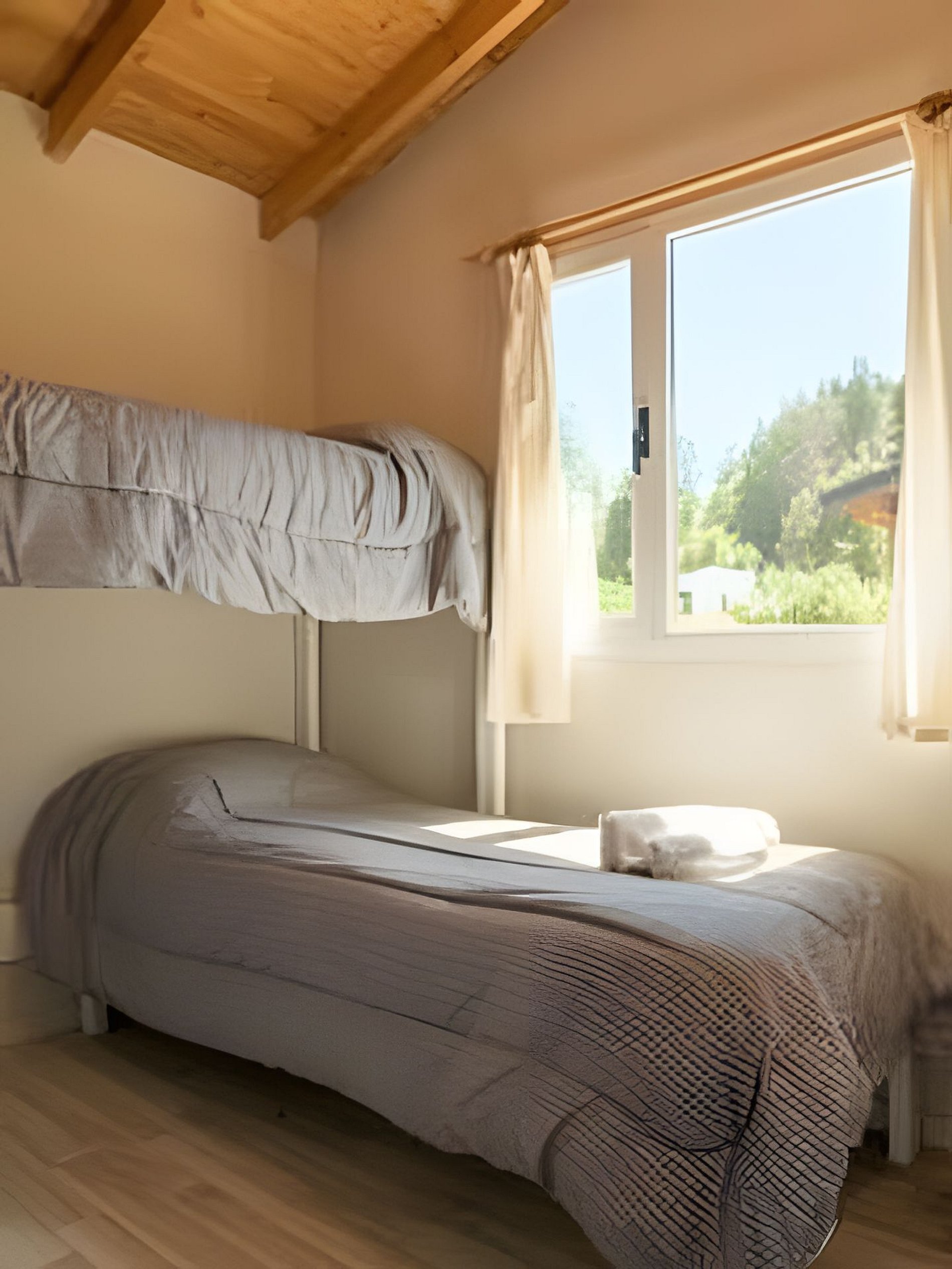 Cabaña en barrio tranquilo , rodeada de naturaleza y vistas increíbles . Cuenta con dos habitaciones una con cama matrimonial y otra con dos camas individuales ( cucheta ) . Living comedor Cocina completa Baño con ducha Sábanas y toallas para la estadía Patio pequeño con parrilla . Estacionamiento dentro de la propiedad . Tv con directv. Internet portátil .