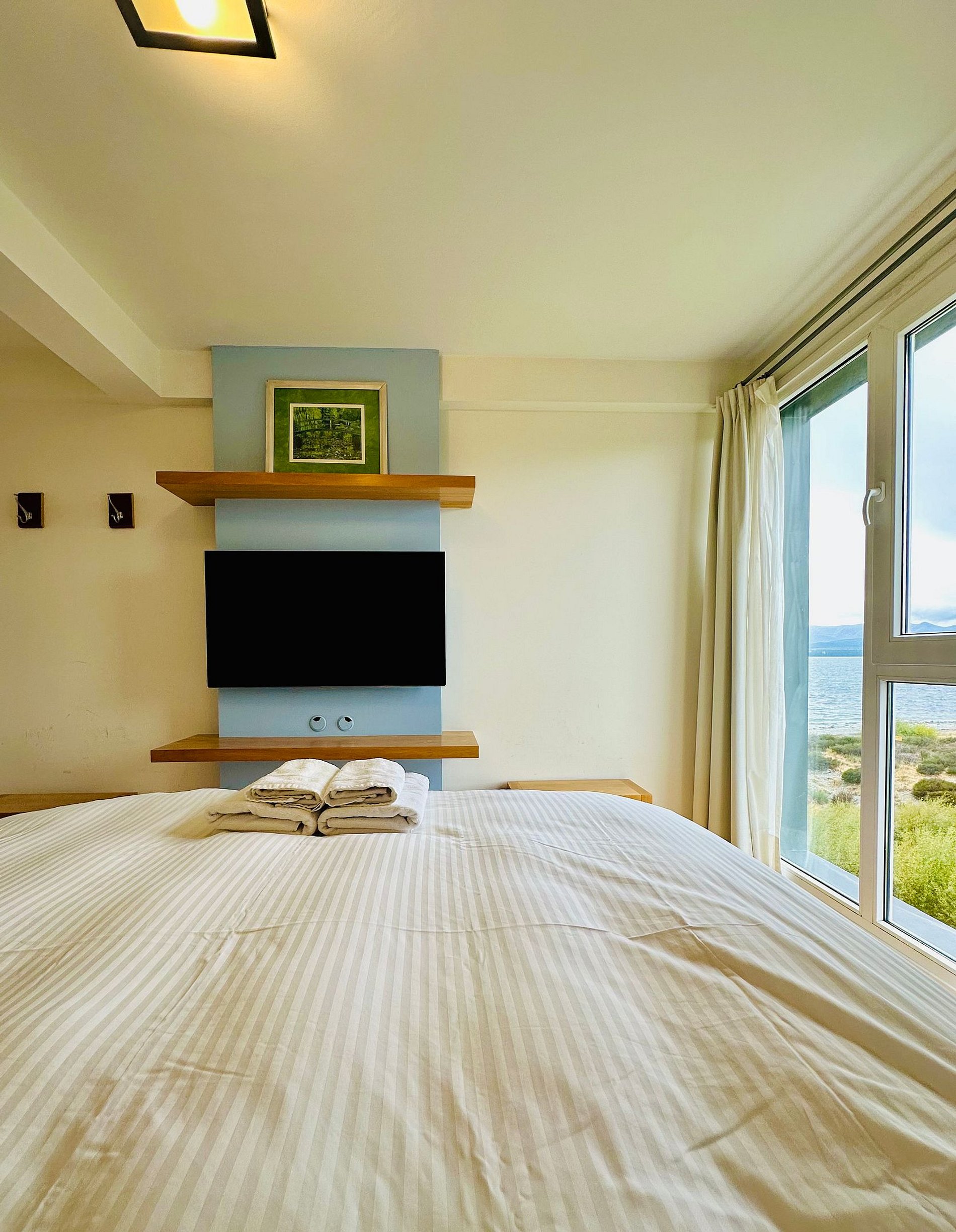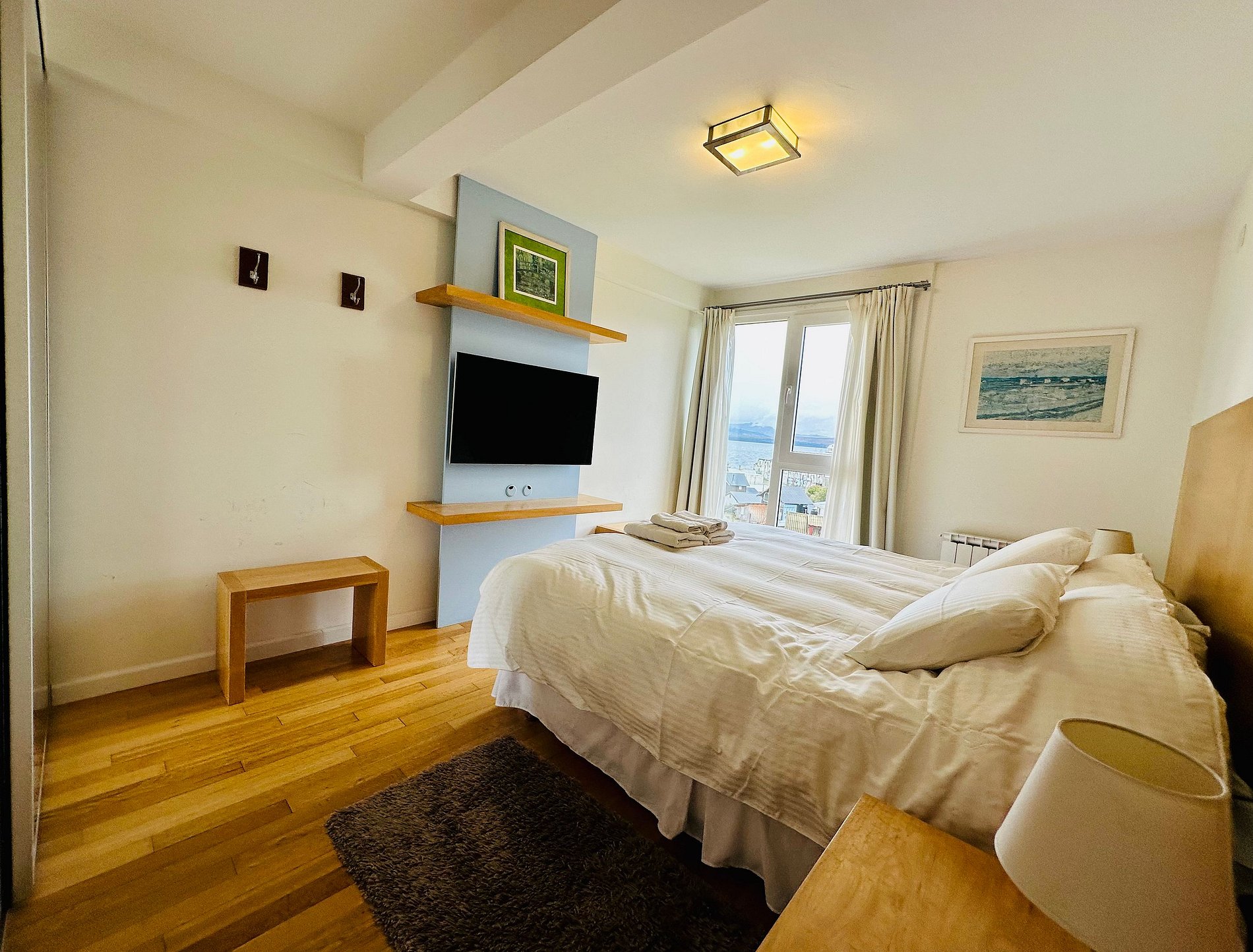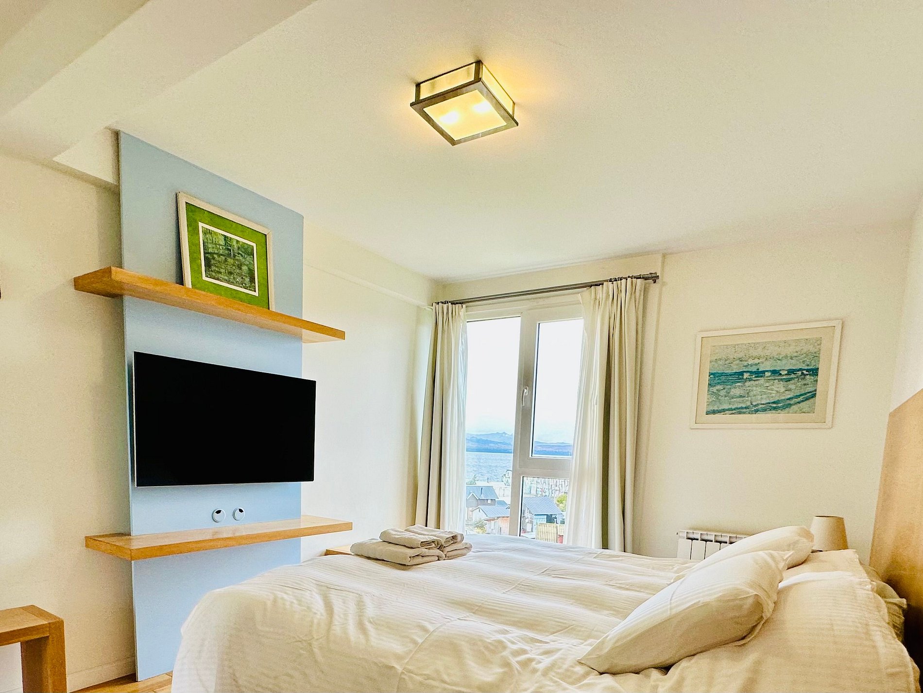 departamento sobre la costa del lago Nahuel Huapi con impactantes vistas al lago y las montañas . Totalmente equipado para 2 personas . cocina completa y zona de lavadero . acceso por ascensor . El complejo cuenta con gimnasio , patio y piscina compartidos. el departamento cuenta con cochera cerrada